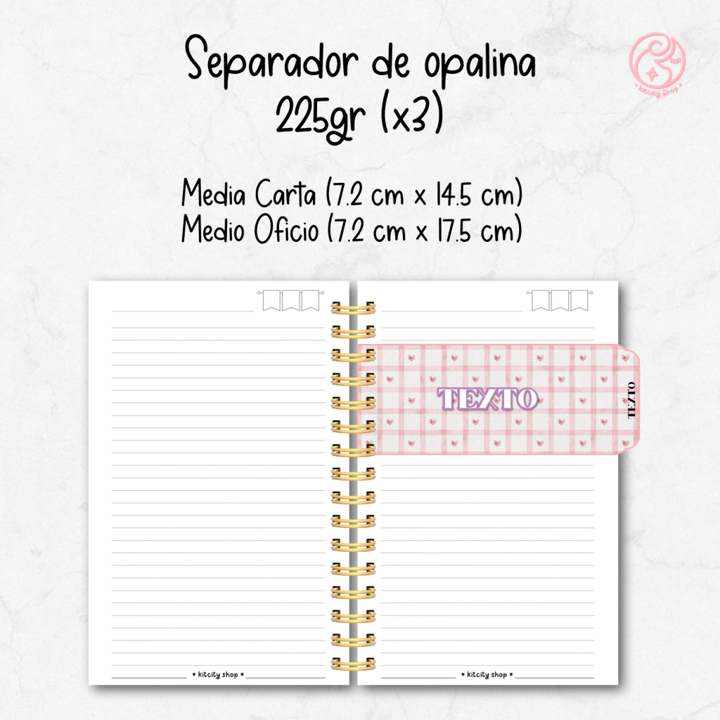 El diseño se realiza a juego con la libreta en colores y temática. Puedes sigerir una imágen para el seprador pero se considerará su uso de acuerdo a que tan bien se ajuste a las medidas.
